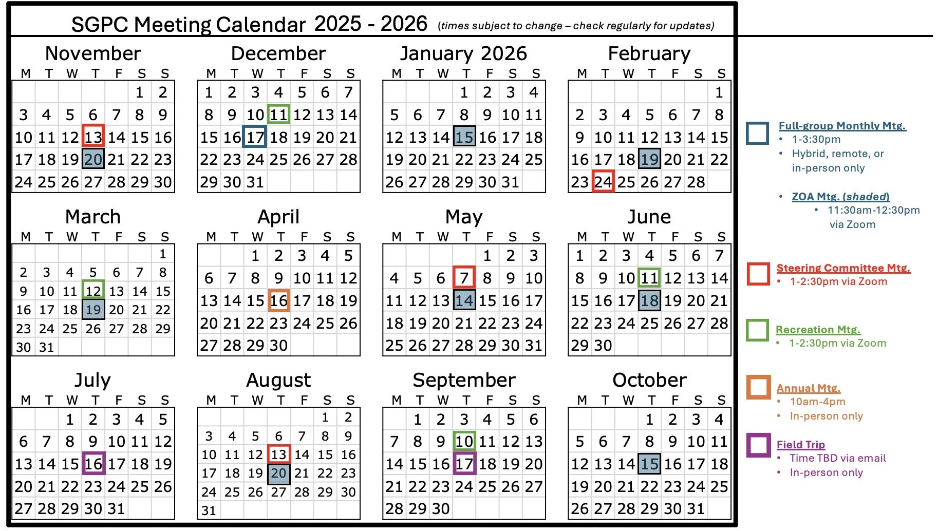 Occur monthly on the third Thursday from 1-3:30pm PST.April-October: Fully in-person, hybrid (i.e., in-person, Zoom), or field trips (TBD).